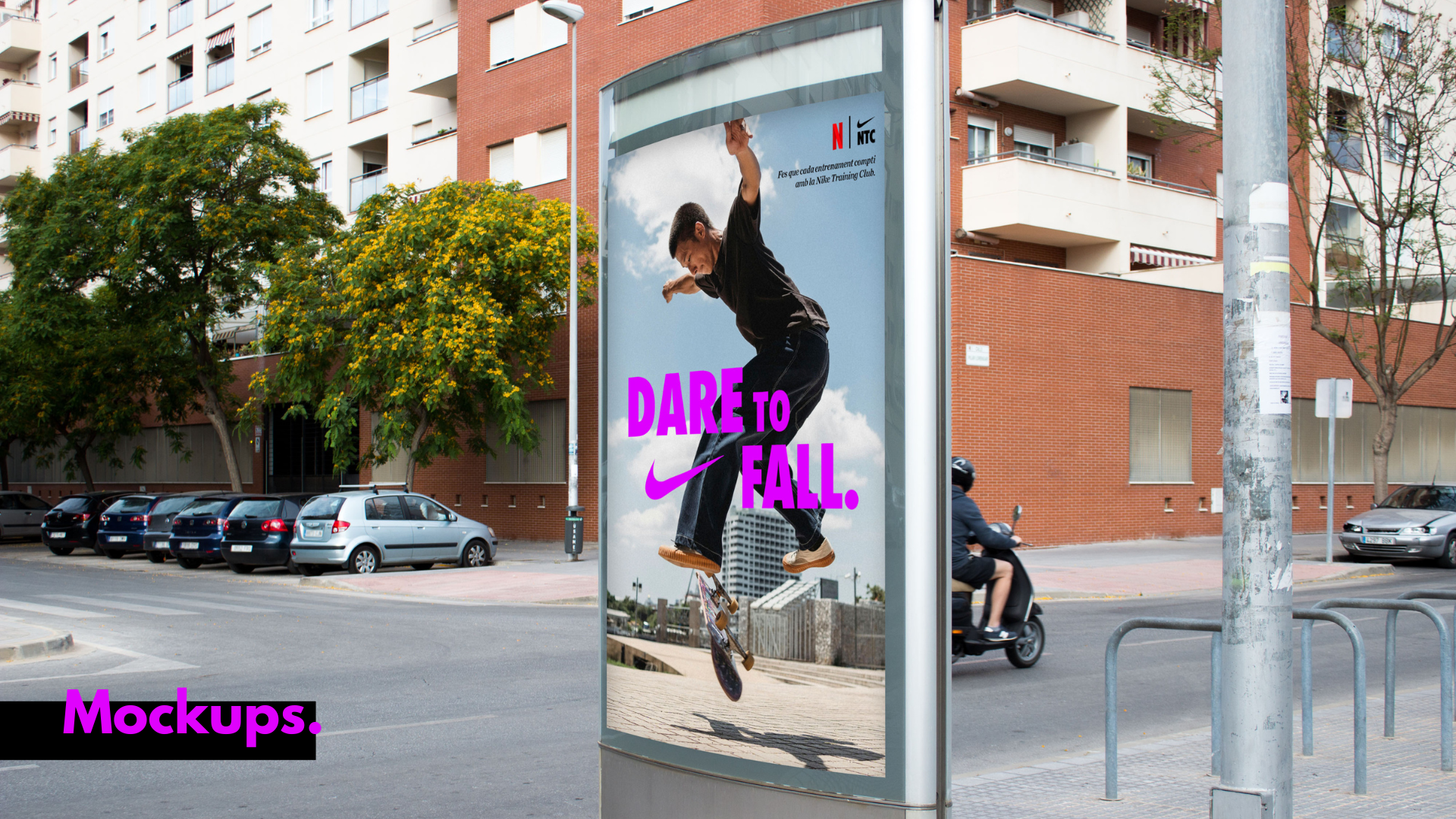 Displayed as a street-level poster mockup in an urban environment, the ad targets youth and action sports enthusiasts directly where they practice. The vibrant magenta text ensures high visibility and emphasizes the bold, progressive spirit of both the Nike brand and the Netflix Training Club (NTC) co-promotion.