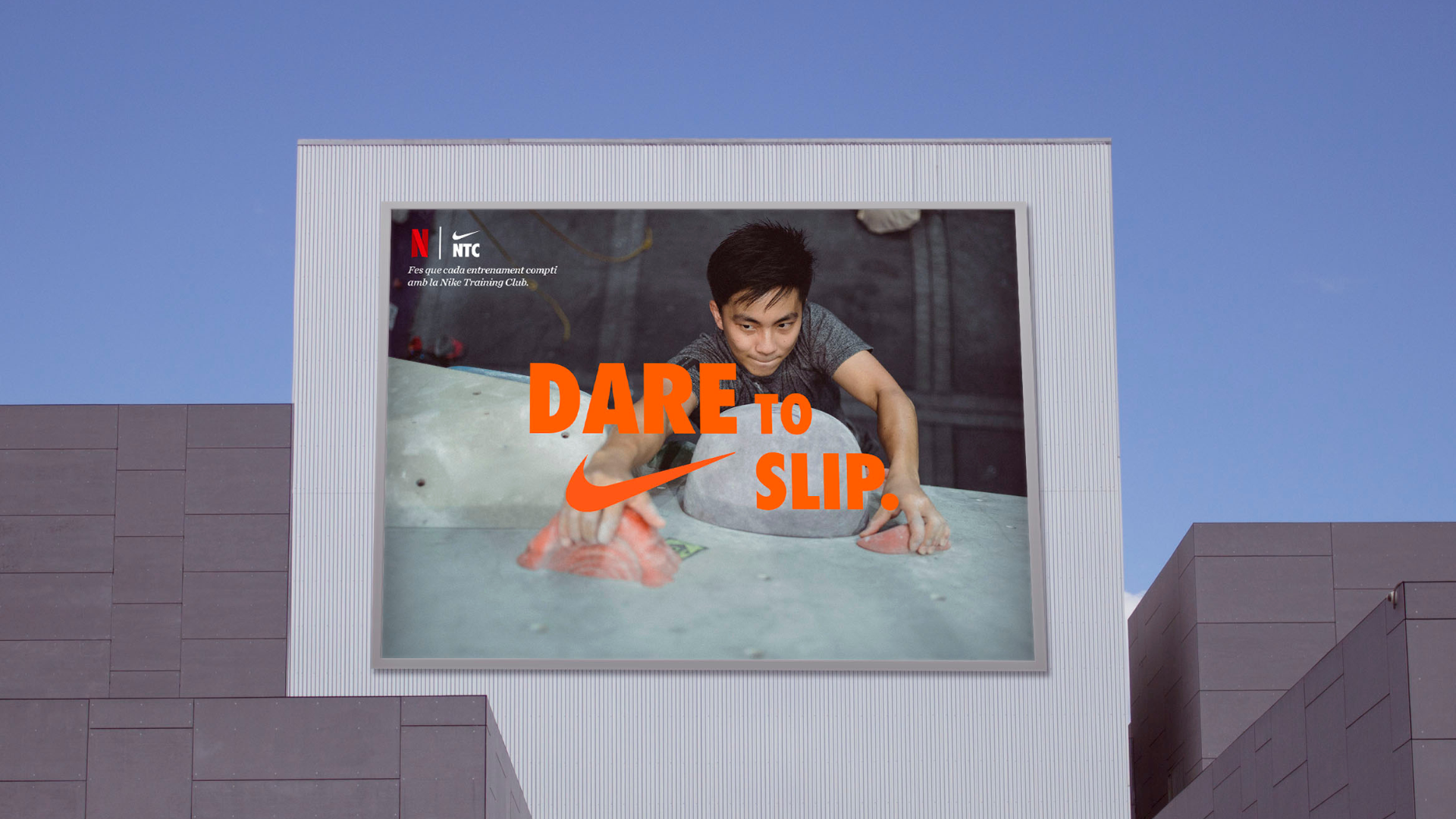 This image is a mockup of the “DARE TO SLIP.” advertisement displayed as a large-scale Out-of-Home (OOH) billboard. The ad, featuring the climber and the slogan with the Nike Swoosh, is mounted on the side of a modern, ribbed building against a blue sky. This placement emphasizes the campaign’s bold message and its broad, public visibility. The execution prominently features the Netflix (N) and Nike Training Club (NTC) co-branding.