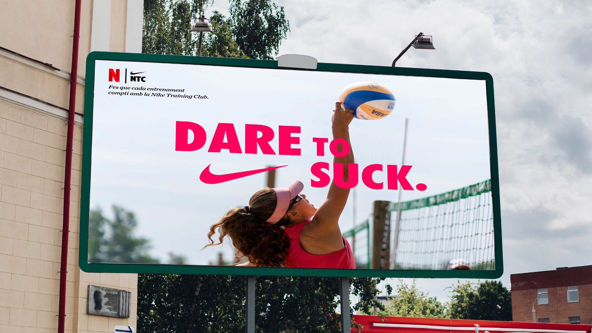 The ad features a female beach volleyball player extending her arm to strike the ball during a serve or spike. The main campaign slogan, “DARE TO SUCK.”, is overlaid on the image in bold, vibrant magenta text. The Nike Swoosh is integrated into the text, replacing the word “to”. The top left corner includes the Netflix (N) and Nike Training Club (NTC) co-branding along with the Catalan caption: “Fes que cada entrenament compti amb la Nike Training Club.”. The billboard is framed against a bright sky, emphasizing the outdoor, athletic setting.